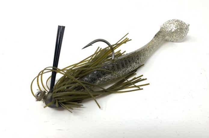 ラバージグにシャッドテールワームをつけたスイムジグ(スコーンリグ)。春は5〜7グラム程度が、ボートでもオカッパリでも使いやすく重宝するウェイト。