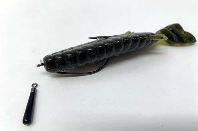 産卵直後のバスは速く動くルアーを追い切れません。そのためワームがゆっくりとフォールするフリーリグがお勧めです。フラット系のワームを使えばよりフォールスピードを落とすことが可能。シンカーの重さは3グラム以下がお勧めです。