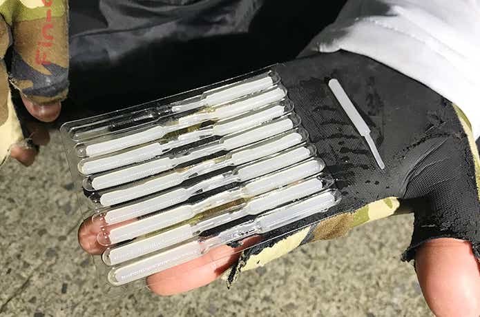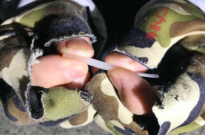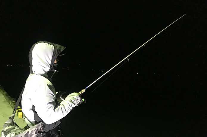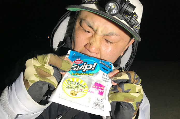 写真を見てもらうとわかるように、既にガルプのエキスが溢れて手袋が濡れています!これが釣れる秘訣ですね。