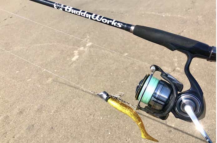 ルアー:バディーワークス 99ヘッド28グラム(プロト)+フラッグシャッド5インチ(ゴルチャバイト)