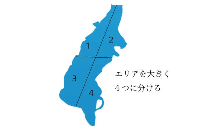 もし、自分の移動手段では全域を回りきれない……というほどフィールドが広大な場合は最初から範囲を限定して、その中で同じようにエリアを4つに分けます。