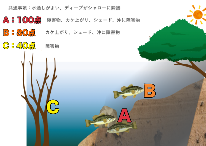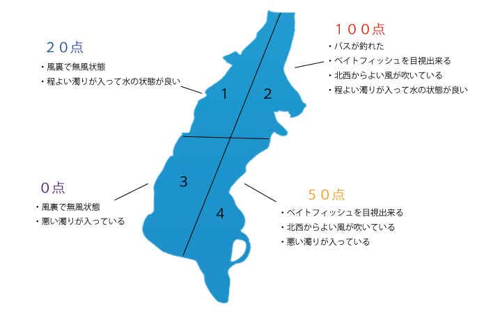 バスフィッシングにはエリア(広域の範囲を示す用語)という考えがあります。当然、良いエリアは魚が濃いですし、釣れる確率もグンと上がります。