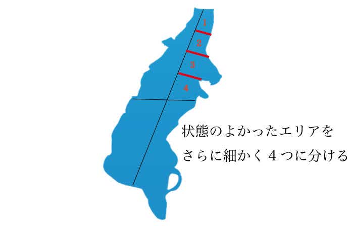 1段階で良いと判断したエリアをさらに細かく4つに分けていきます。ここでのランガンも5投。範囲が狭まった分、段階1よりも投げるポイントは当然増えます。