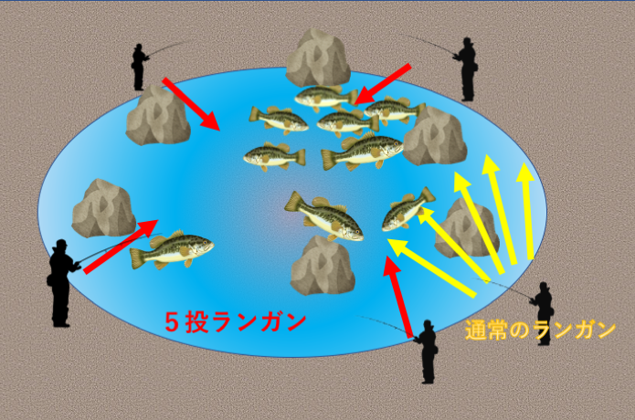 ランガンとはラン&ガン(RUN&GUN)の略称。一箇所で魚を待つ回遊待ちとは異なり、歩き回って積極的に移動し、銃のように連打で広範囲を探って魚と出会う確立を高めるスタイルです。