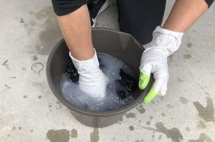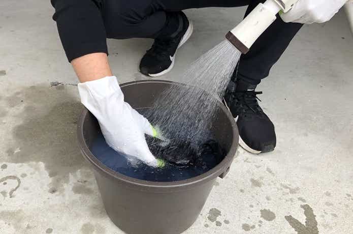 ②液剤が全体に行き渡るようウェアをバケツ内で回します。