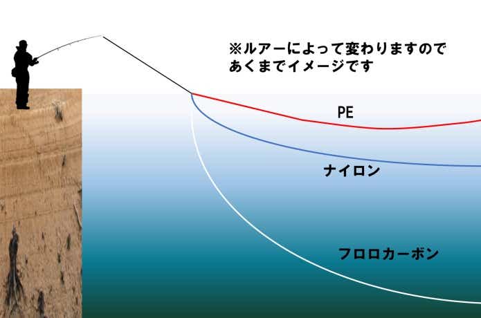 PE、ナイロン、フロロでは同じルアーを使っていても泳ぐレンジに差が出てきます。