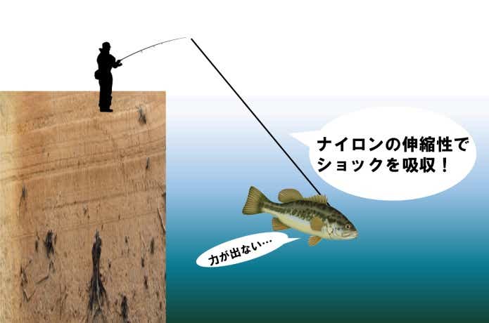 ナイロンラインは伸縮性があり、ショックを吸収する力において、どの種類のラインと比べても長けています。