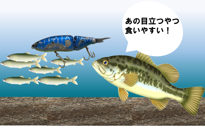 例えばベイトの大群が入っている時。ベイトと同じサイズのルアーだと目立たないため、バスがルアーを見つけてくれない事があります。