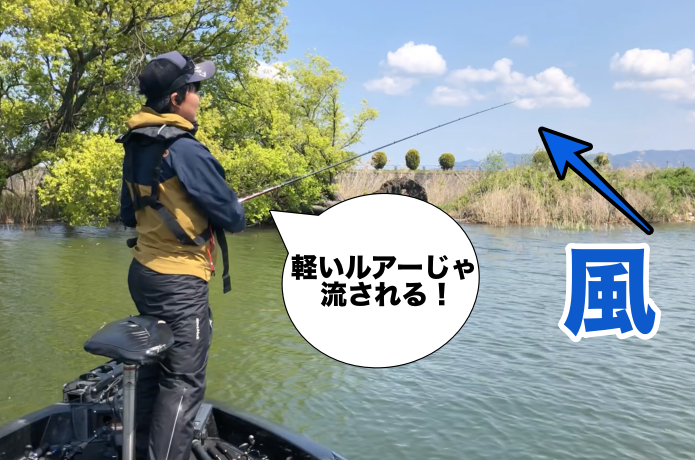風が強い時は糸が流されやすいので軽いルアー=小さいルアーではコントロールが効かない事があります。