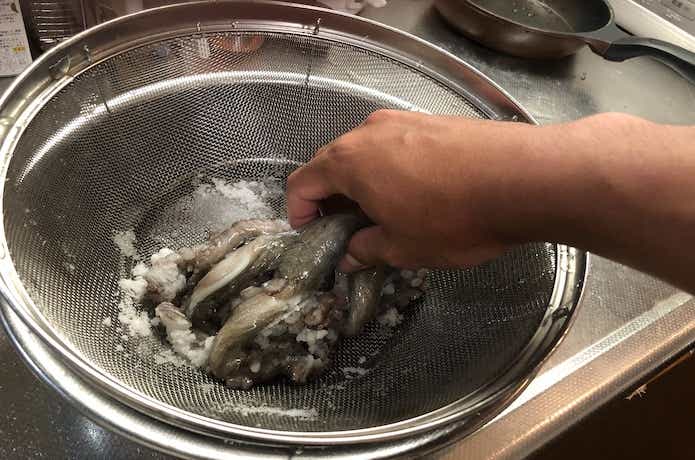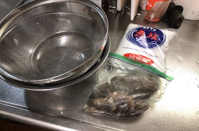 内臓をとったタコと大さじ1〜2杯程度の食塩を金ザルに入れ、タコを網に擦りながらぬめりをとります。