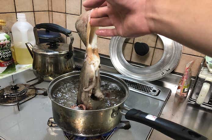 タコを茹でる時は頭部分を持って、脚先から熱湯につけていきます。
