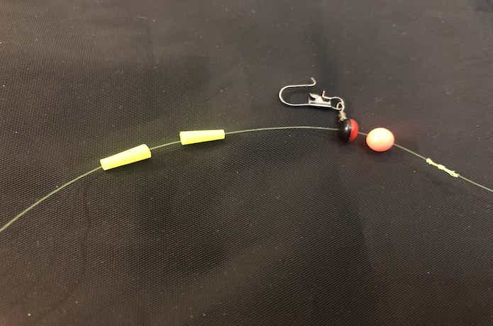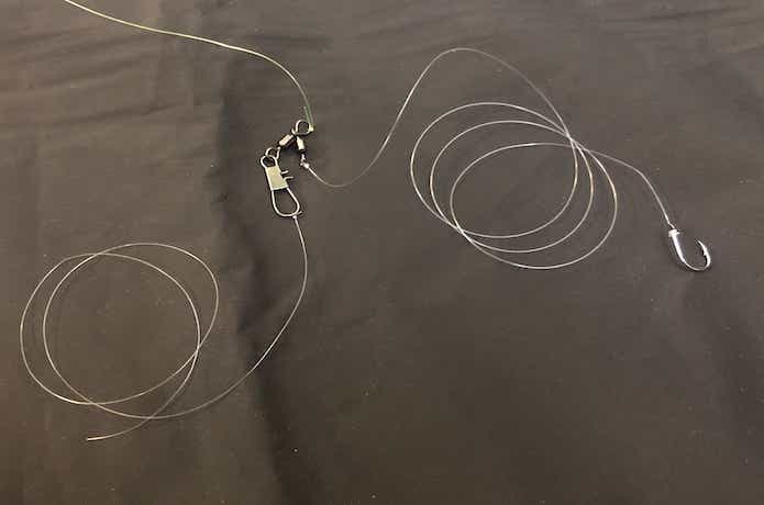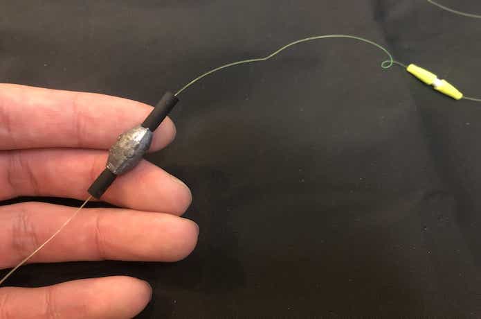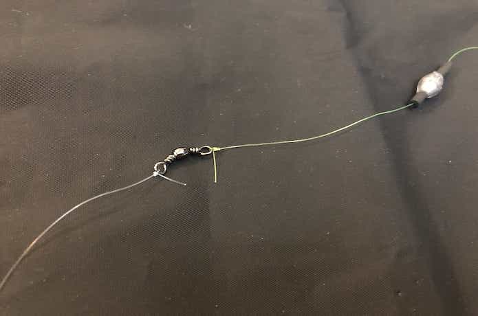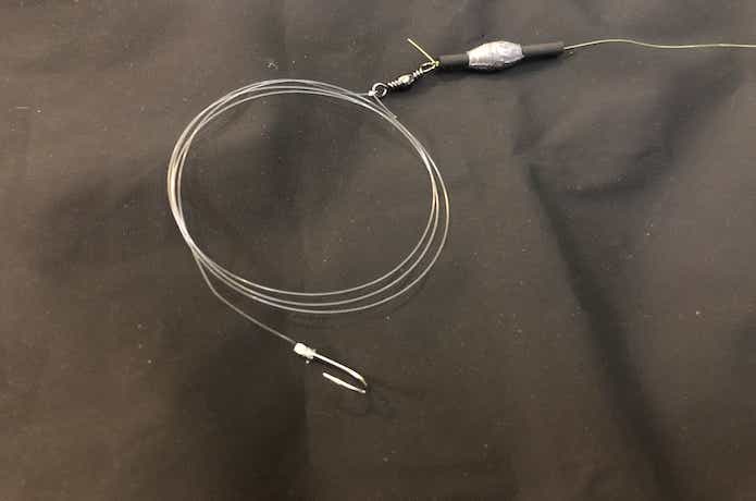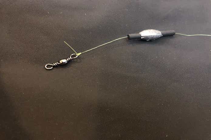 捨て糸の先端にスナップサルカンを結び、オモリを取り付けて完成です。