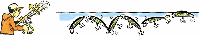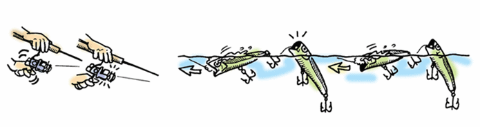 リールを巻きながらロッドを小刻みにシャクリ、ルアーに不規則なアクションを加えます。小魚が逃げ惑う際の動きや、小魚の反射の様子を演出したアクションで、ミノー・シャッド・スティックタイプのワーム等で使用します。