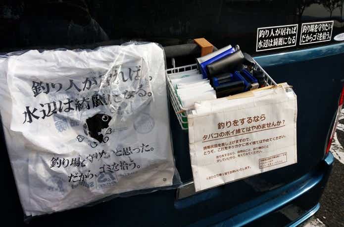 その隣には、「釣り人が居れば水辺は綺麗になる」とプリントされたポリ袋の束も見受けられます。