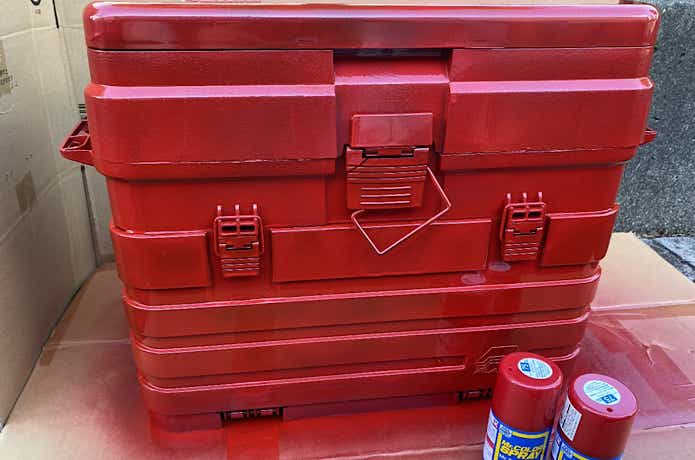 一度塗りだとタックルボックスの方はまだ色が薄い気がする。乾いたらもう一回シュシュっとしよう。