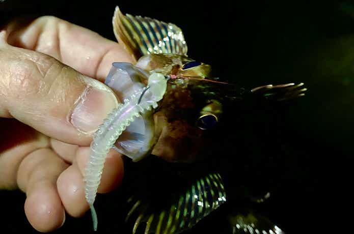 フォール中に触りやアタリが一度でも出たら、長くて柔らかくてリブが深いワームで探り直してみると面白いと思います。