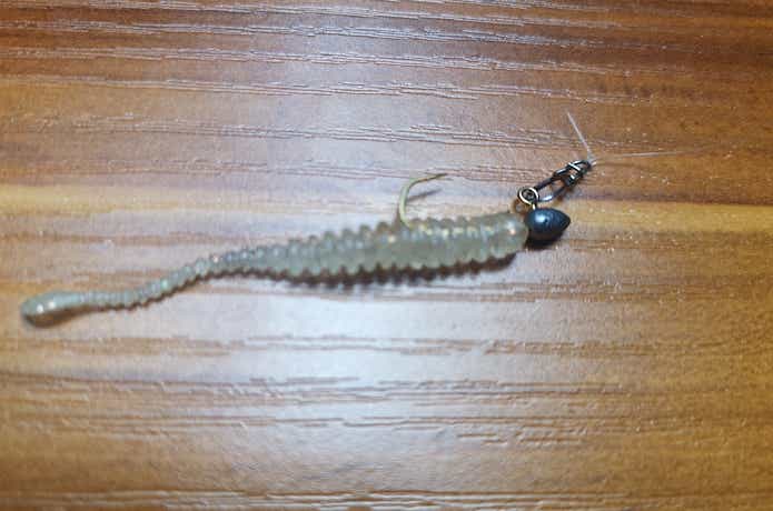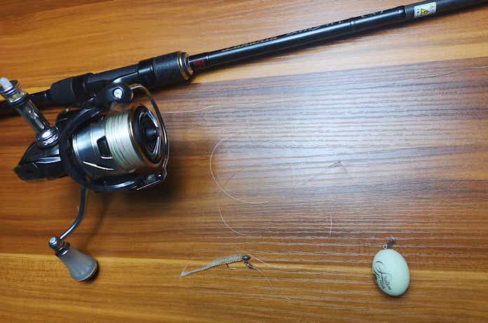 そしてそのさきに、リーダー(4ポンド〜8ポンド程度)を取り付けて、スナップ、ジグヘッド(0.5g前後)で、完成。