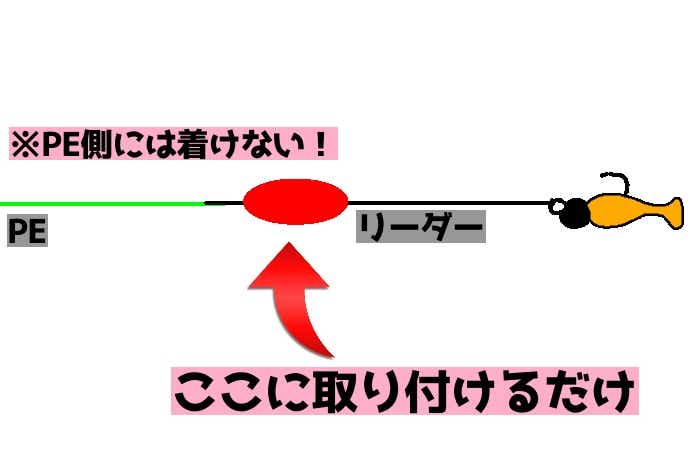 リーダーの途中で8の字結びで結ぶのが良い。とメーカーホームページにはありますが、ウエイトが重い分、魚への違和感も大きいので、筆者は中通しタイプのフロートと同じように使っています!