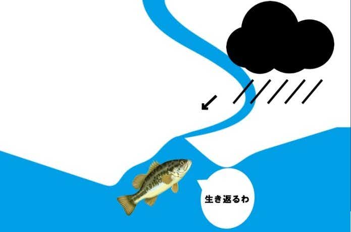 雨によって酸素の含んだ水が供給され、水に含まれる残存酸素量が増します。バスも生き物なので酸素は重要です。