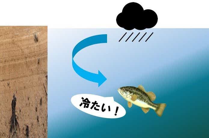 また雨による水の供給で水量自体が増加します。水量が増えることで春などはシャローに魚が上がってきやすいと言われています。