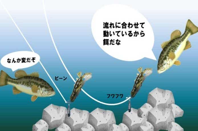 ルアーは水の流れで自然に動き、頭の良いバスにも口を使わせます。