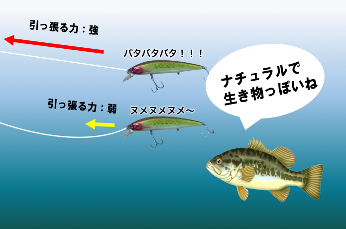 ところが自然界でバスの捕食対象となる餌は、そんな動きをすることはありません。