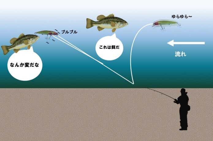 ラインにテンションをかける事で、ルアーは水の流れよりも早く動いたり、流れに逆らって動きます。