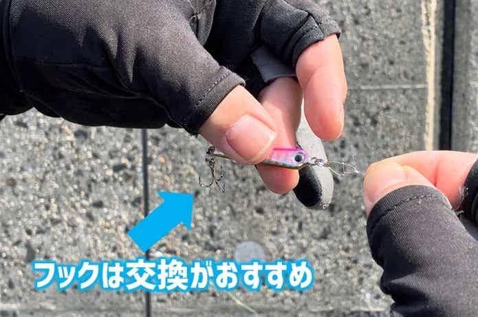 刺さりも悪く、不意な大物に対応できるようフック交換をオススメします。