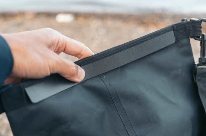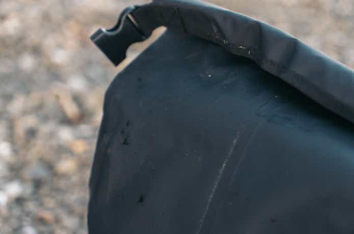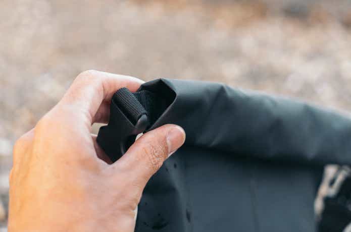 写真のように丸めたら、バックルでカチッと止める。これで水の侵入をかなり防げます。
