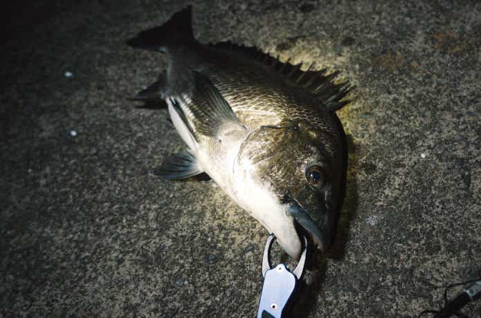 岸際にスッと落とし込んで数投目。なんとめちゃめちゃ良いサイズのチヌが釣れた!