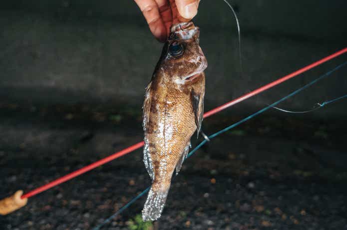 ジグヘッドで潮に乗せてサ〜っと流してやる。すると、なんとメバルも釣れました。分かっちゃいたけどフナムシ、エサとして優秀過ぎます。