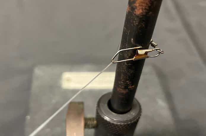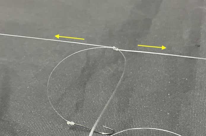 端糸が解けないように本線と端糸は束ねて持っておき、掛けていたスナップサルカンを外します。