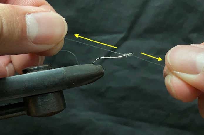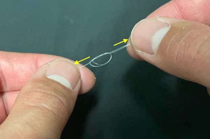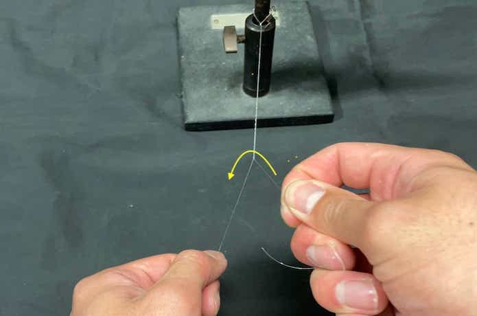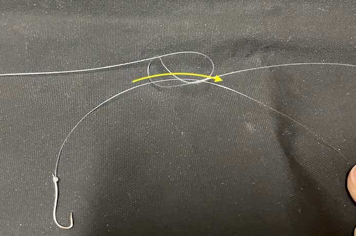 エダスの長さを調整しつつ、端糸を輪の中に2回くぐらせます。