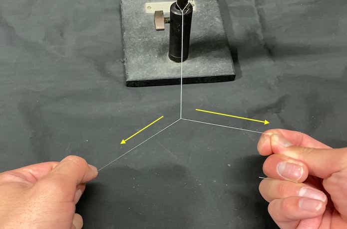 一定の間隔で糸を張って、撚り合わせた部分の間隔を少しずつ詰めていきます。