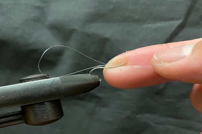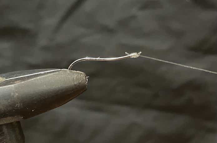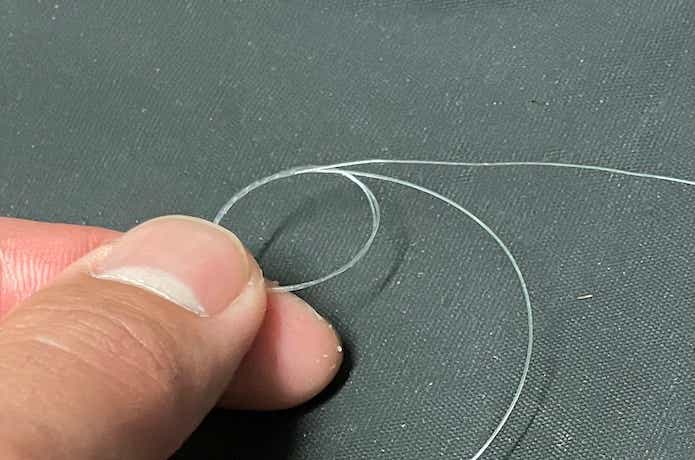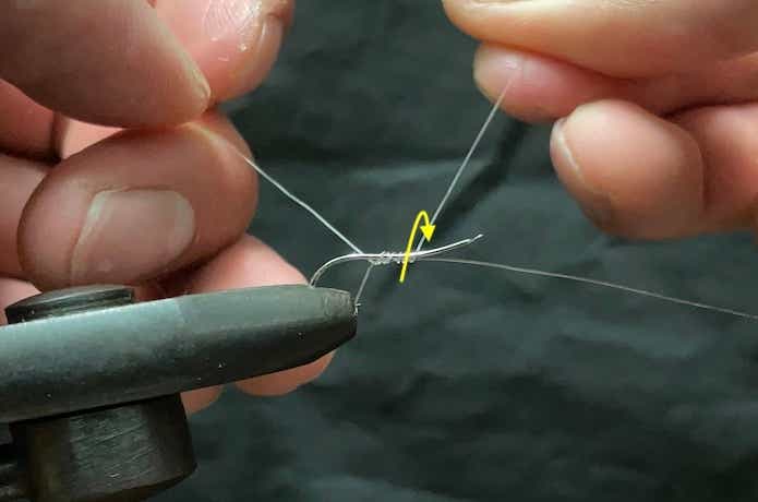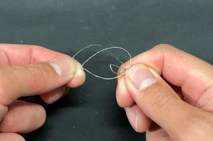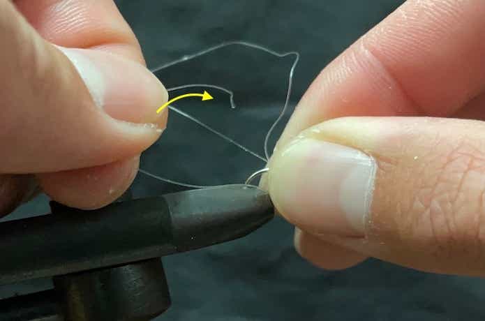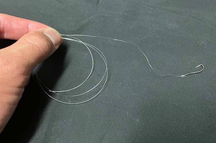 エダス用ハリスで輪を作り、針の軸に重ねます。