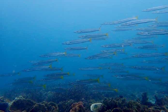 堤防際の大物は不在のようですが、スズメダイやネンブツダイの群れが映ります。