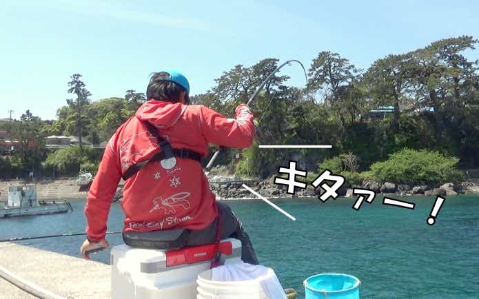 そうこうしていると「ズシッ!」と重量感のある手応えが磯竿に来ました!