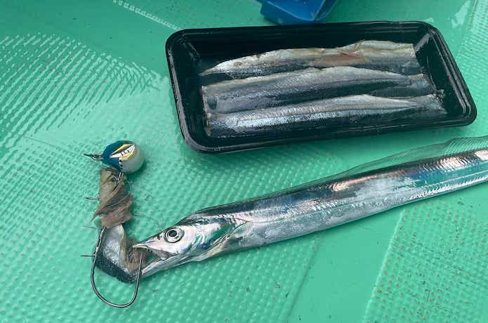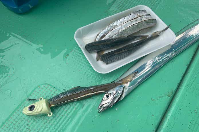 イワシとは異なり、ボロボロになってもタチウオが食ってくるのでエサ交換の頻度が低く、高活性時に手返しよく釣りができます。