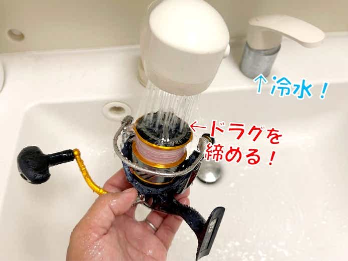 まずは、洗う前にドラグをしっかり締めましょう。そして冷たい水道水でリールの上部からシャワーで洗い流しましょう。