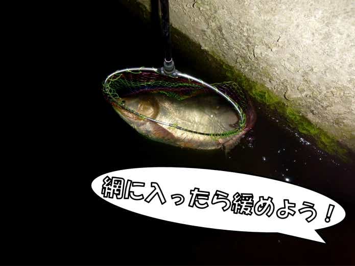 タモ網に魚が入った後、糸を張らないで