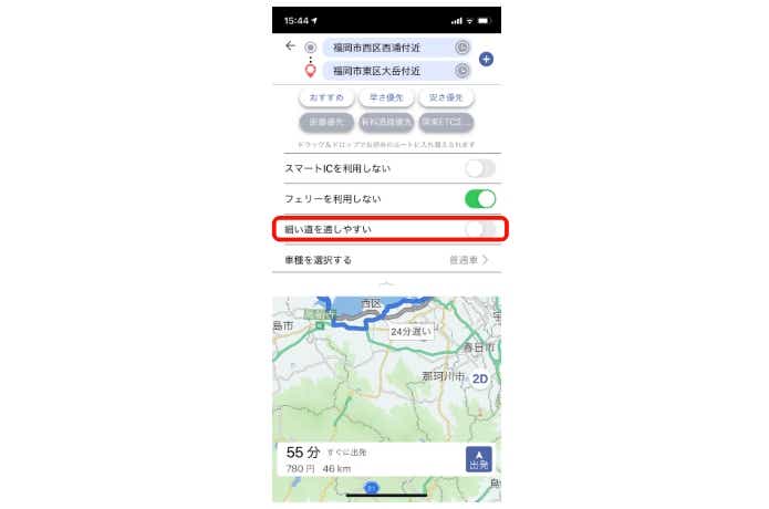 moviLink(モビリンク)には、「細い道を通しやすい」のオン/オフ機能が搭載され、細い道を回避するルート設定も可能。
