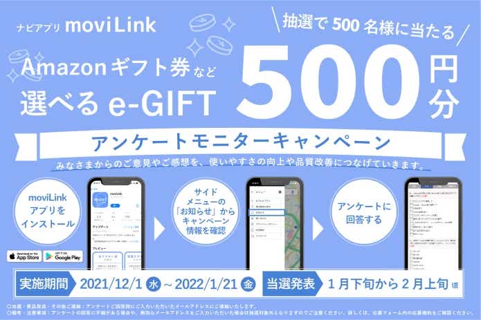 スマホ用カーナビアプリ「moviLink(モビリンク)」は、App StoreまたはGoogle Playからダウンロード可能。