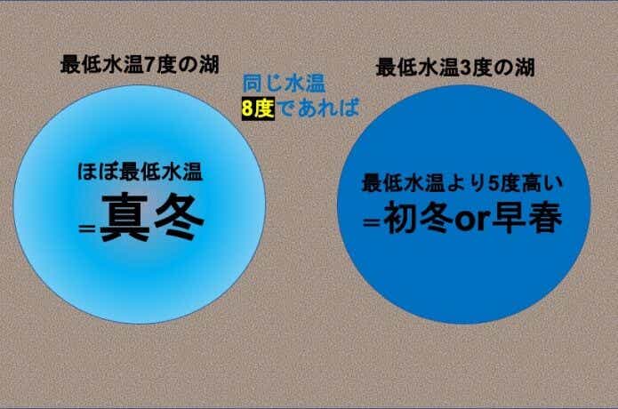 反対に“最低水温7℃前後の湖”においてはおおよそ水温が下がりきった冬の状態と言えます。