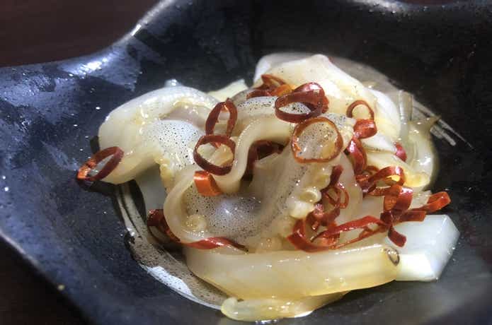 アオリイカの身の甘さとトウガラシの辛さが絶妙にマッチする塩辛。食べ出すとご飯が止まらず、すぐになくなってしまいます。