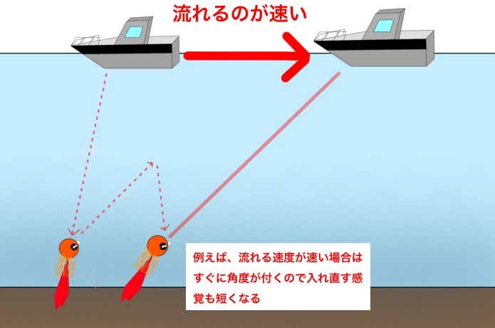 また、船は流れ続けているので、着底してからもラインは出続けます。
