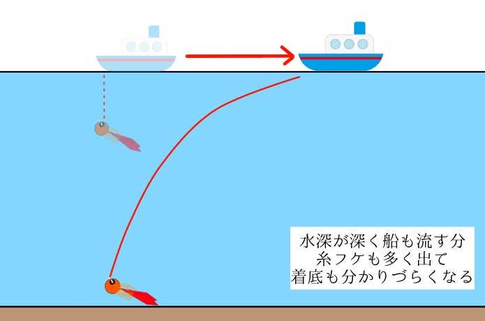 船を潮と風に乗せて流すため、タイラバが着底する頃にはラインが斜めになり、海中に糸フケも出ています。