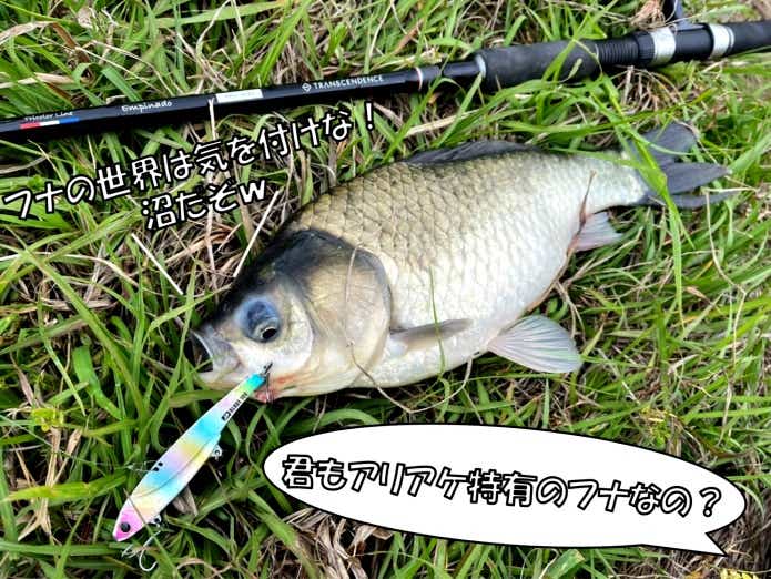 立ち位置を後退させながら釣りをしていると、早速バイブレーションに生命反応! 全然引かないので、「小ボラかな?」と思って釣り上げてみるとフナでした(笑)