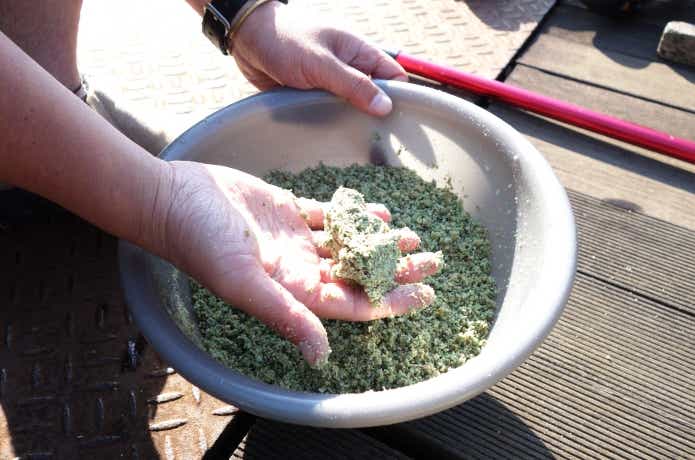 僕はオキアミ3kg +配合餌1袋 +さなぎ粉2袋(特袋)程度の割合で混ぜますが、配合餌を減らしてさなぎ粉を増やしても良いです。その場合はパン粉を加えるか、粘り気が強い配合餌を使いましょう。
