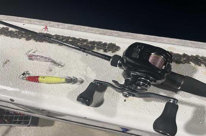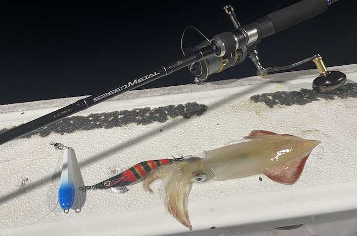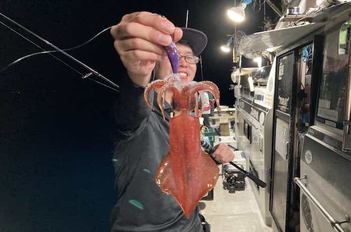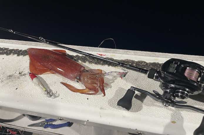 我慢の時間は長かったですが、イカが居食いしているようなモゾモゾ系のアタリを捉えてヒット!