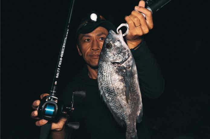 結局日中はなかなか釣れず……すっかり日が暮れてしまいましたが、実は夜のほうが断然釣りやすいのがチヌ。ミノーをゆっくりとフラフラ泳がせているとガツンと食ってきました。
